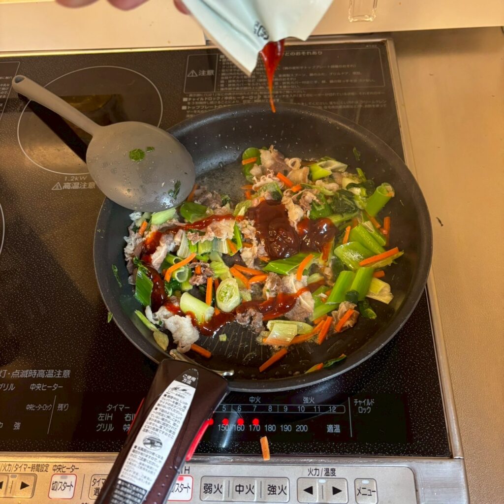 牛肉に火が入ったところでたれを入れて炒め合わせます。