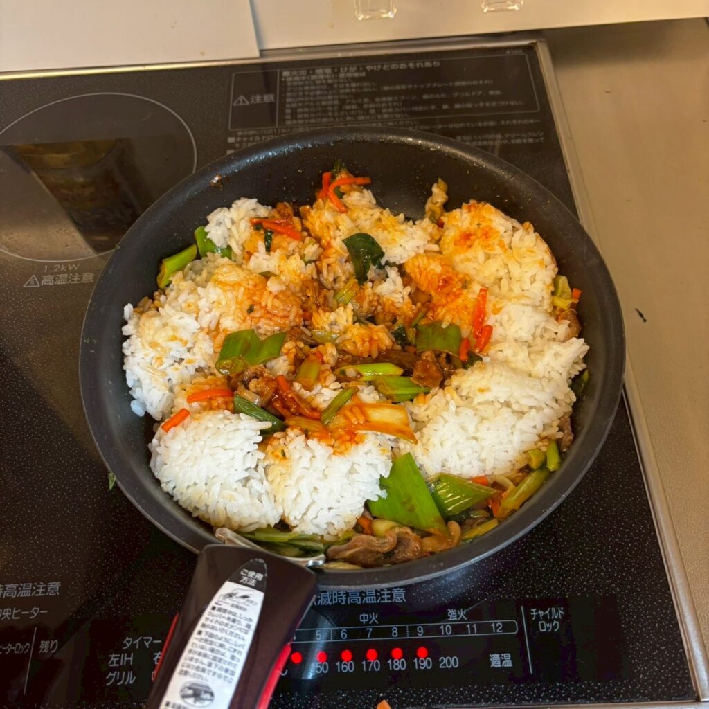 たれがからまったらレンチンしたご飯を人数分投入。今回は二人分。