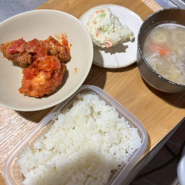 この時はつくりおきのおかずと、冷凍ご飯、前日のみそ汁で済ませました。